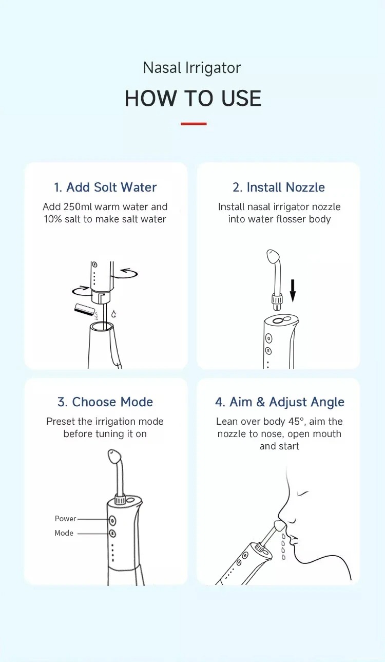 Eficacia: Los irrigadores nasales eléctricos están diseñados para proporcionar una irrigación constante y controlada, garantizando una limpieza profunda de los conductos nasales y promoviendo la salud de los senos nasales.
