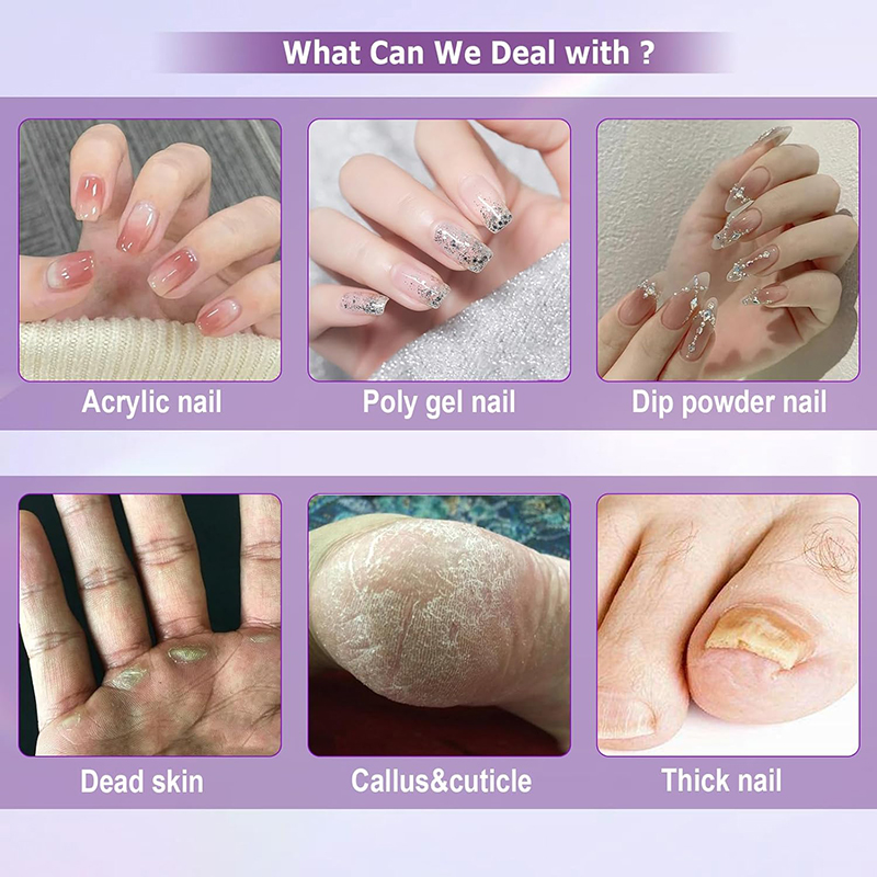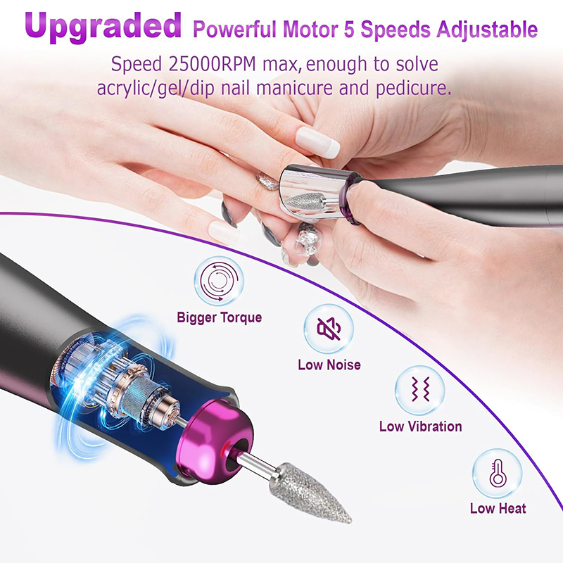 Taladro eléctrico para uñas El potente motor mejorado es perfecto para todas sus necesidades de manicura y pedicura, incluida la eliminación de uñas acrílicas, uñas de poligel, gel de escarabajos, uñas en polvo, cutículas, piel muerta, callos y uñas gruesas.