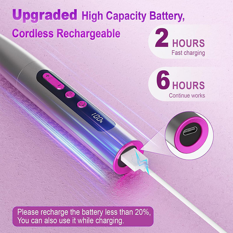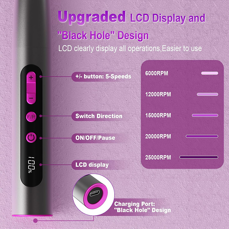 taladro de uñas eléctrico Batería de alta capacidad mejorada, 2 horas de carga rápida y 6 horas de trabajo continuo. La lima de uñas eléctrica es adecuada para su adaptador de corriente USB, computadora portátil, energía móvil, etc. Si la potencia del taladro de uñas inalámbrico es inferior al 20%, también puede usarla mientras se carga.