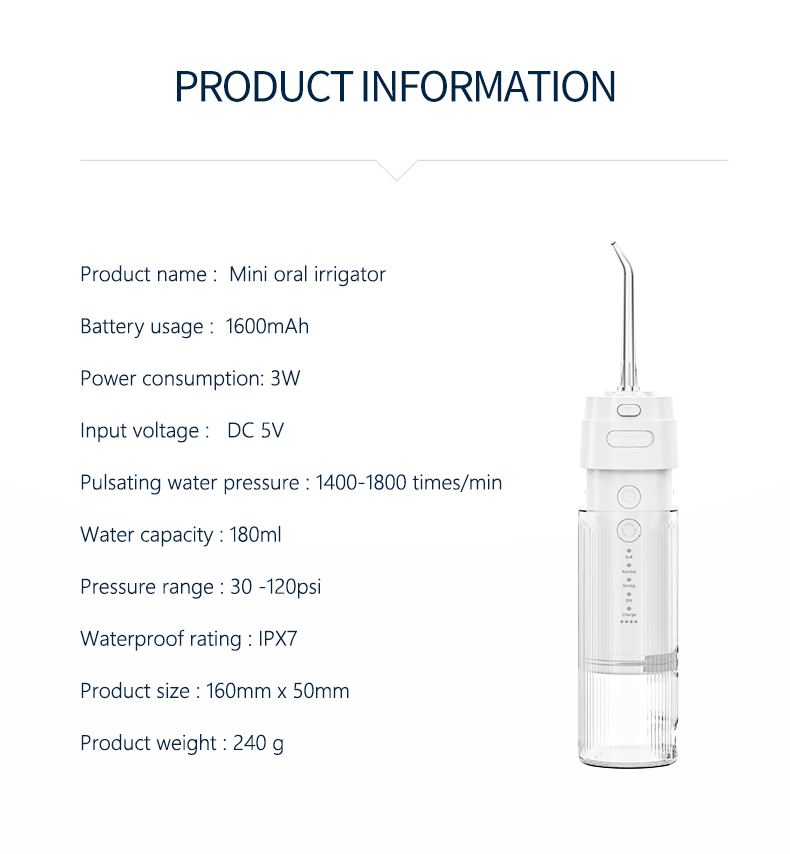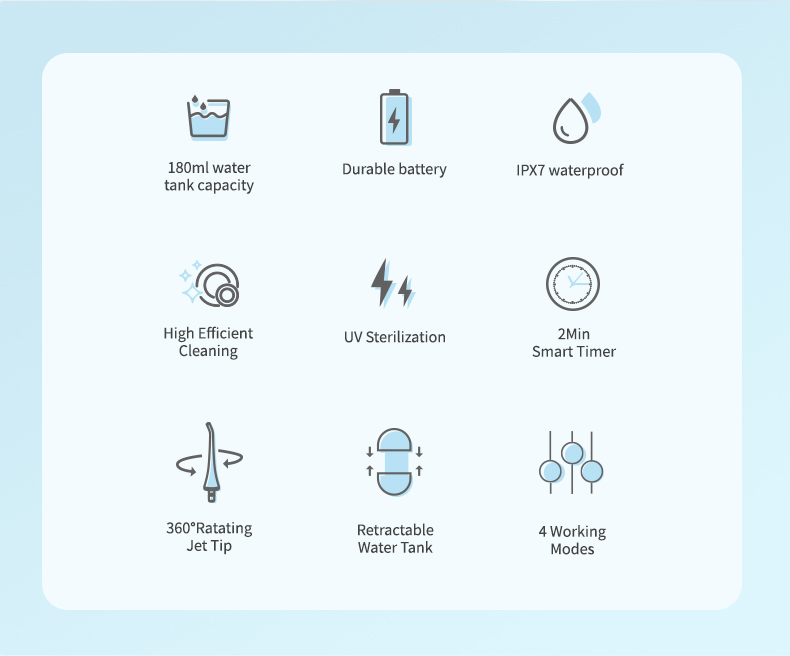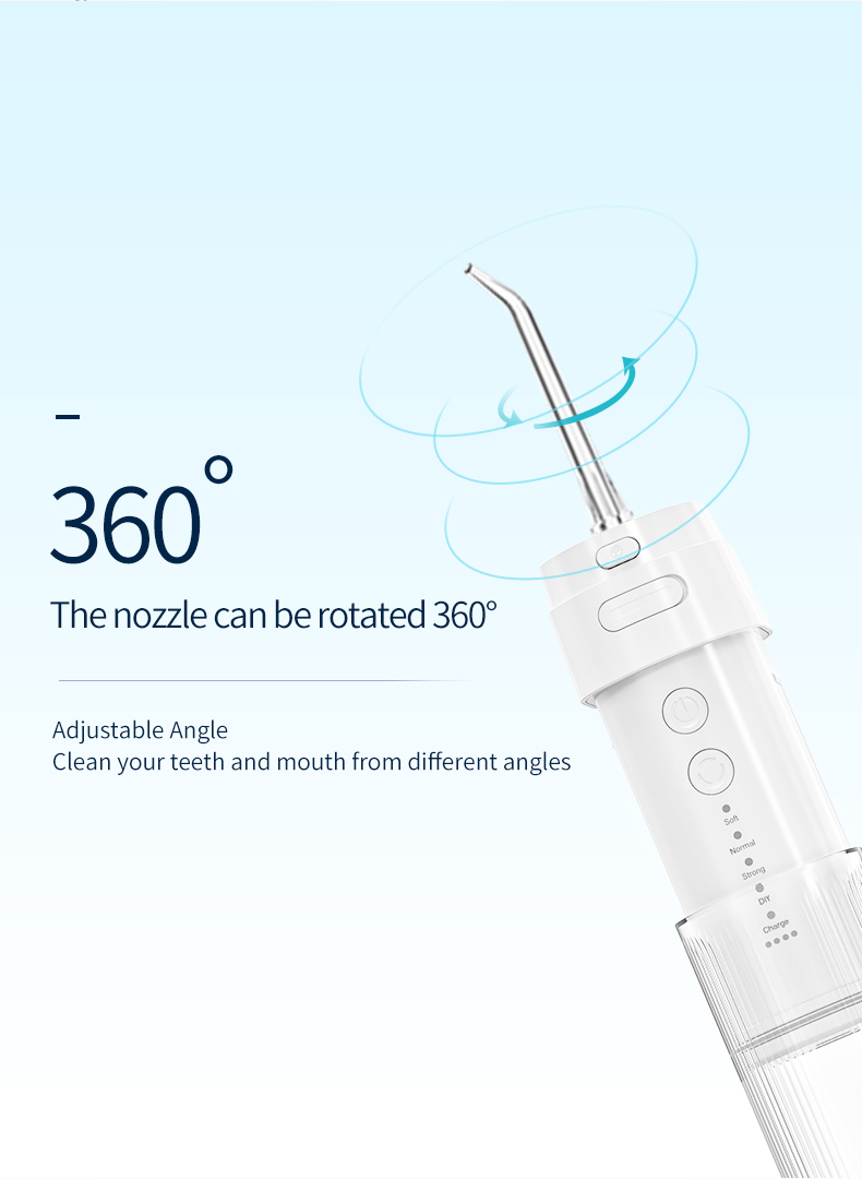Este irrigador bucal con chorro de agua emite pulsos de alta presión de agua de 1400 a 1800 veces por minuto, eliminando eficazmente el 99,9 % de la placa dental para una limpieza profunda de los dientes. Este irrigador bucal con chorro de agua masajea las encías, promueve la circulación sanguínea y trata problemas bucales como el mal aliento y los dientes ortodóncicos.