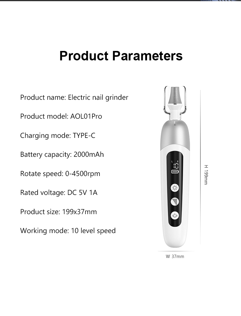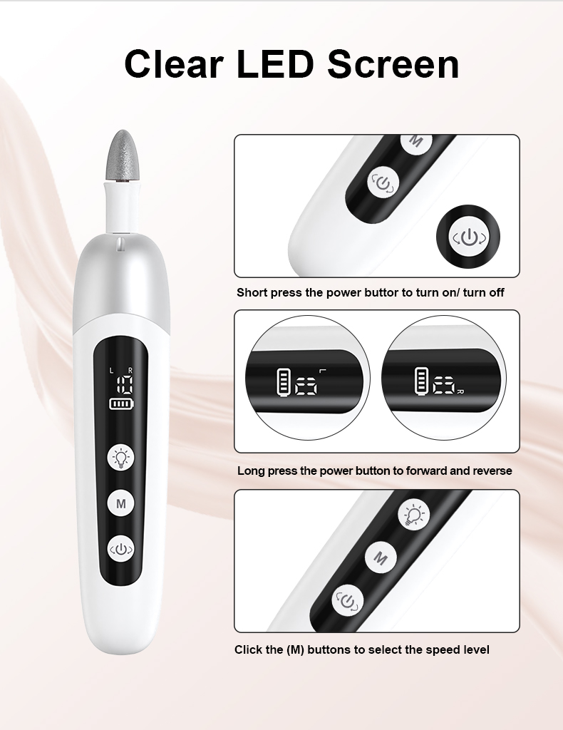 - PANTALLA LED INNOVADORA: Navegue sin problemas por los ajustes deseados con facilidad. La pantalla LED indica el estado de la batería, la preferencia de velocidad y los ajustes de rotación para un funcionamiento sin esfuerzo. La máquina eléctrica para limar uñas también está equipada con una luz LED integrada que ilumina las áreas de las manos y los pies.
