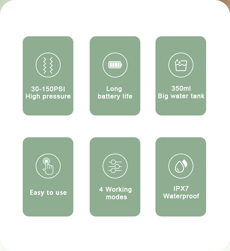 Nuestro palillo dental de agua inalámbrico cuenta con una impermeabilización superior, lo que permite una fácil limpieza y un uso seguro durante las duchas.