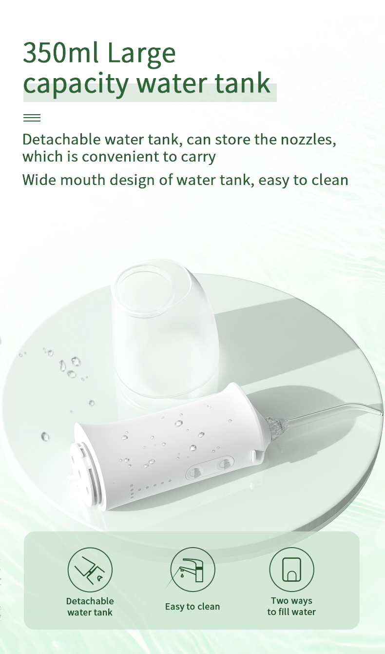 Este hilo dental de agua cuenta con un tanque de agua mejorado de 350 ml, el doble de capacidad que otros modelos antiguos, lo que elimina la necesidad de recargas frecuentes y hace que su limpieza bucal sea más conveniente y eficiente.