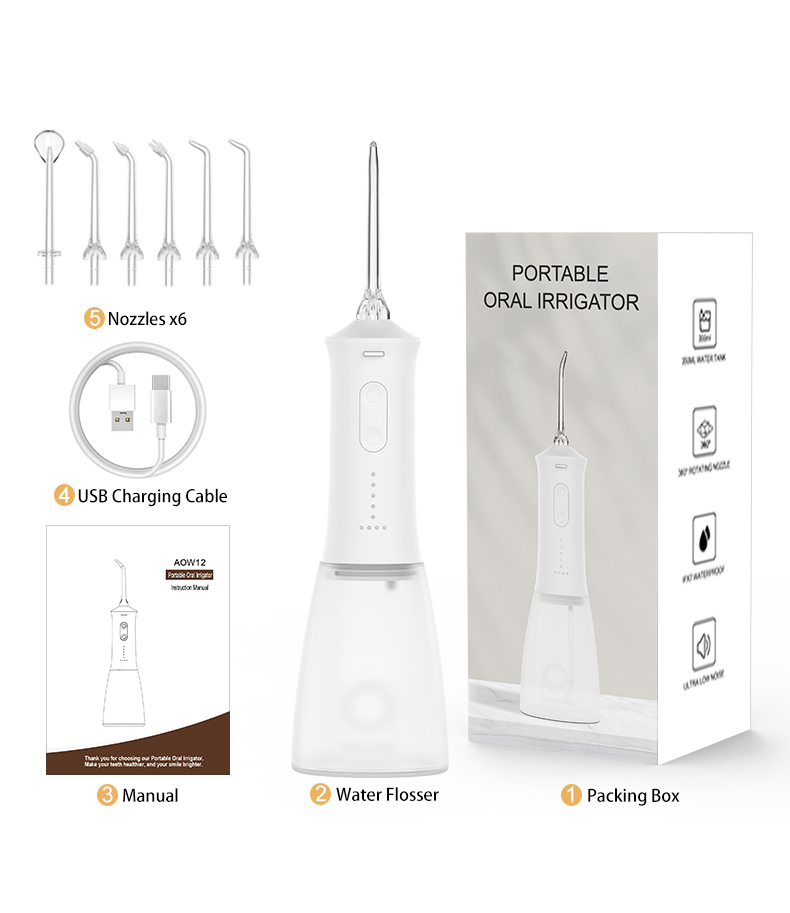 Paquete: 1 cuerpo de irrigador bucal + 5 puntas + 1 cable USB + 1 manual de usuario + 1 caja de regalo.