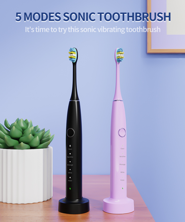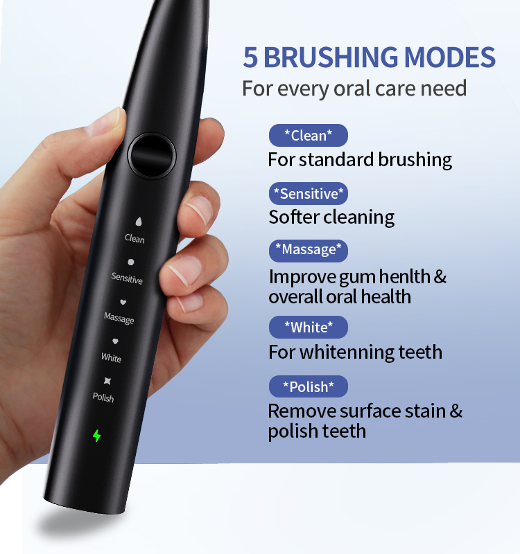 - 5 MODOS DE CEPILLADO DE ALTO RENDIMIENTO: Limpio (suave), Blanco (fuerte), Pulido (frecuencia invertida fuerte), Más suave (frecuencia invertida suave) y Sensible (suave) para adaptarse a diferentes condiciones de los dientes y las encías, para que pueda elegir diferentes modos según sus preferencias y las recomendaciones del dentista.